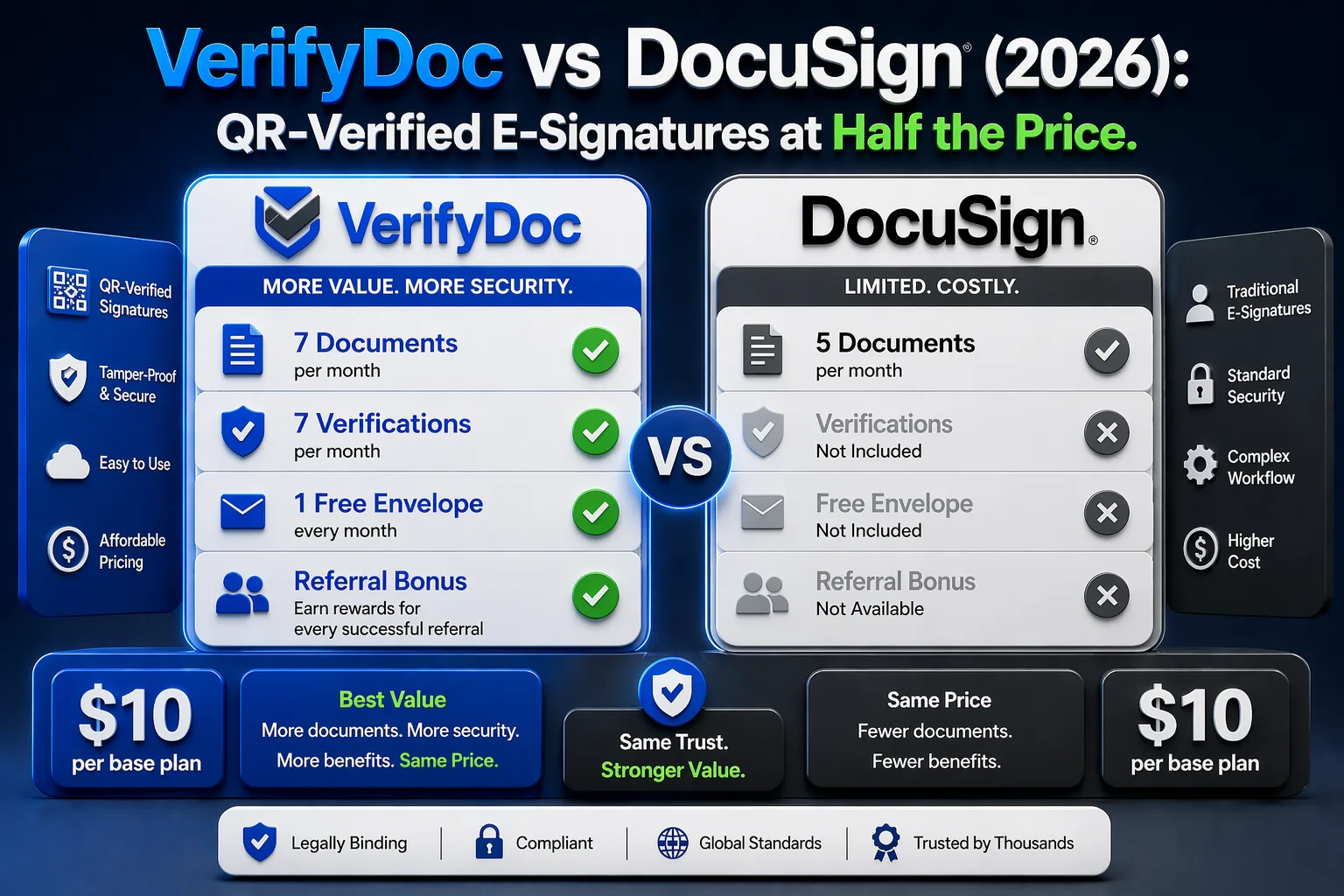 A candid comparison of VerifyDoc and DocuSign — QR-code Certificate of Authenticity, cheaper pricing, native Word and Google Docs plugins, and why a signature alone no longer proves a document is real.