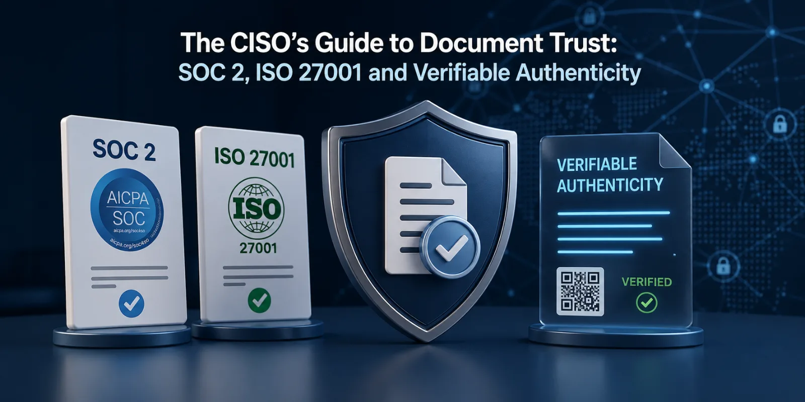 This is the document-trust gap. It sits in the seam between the security framework's view of information at rest in your systems and the real world's view of a document moving through someone else's inbox, file share, and printer queue. This guide walks through where SOC 2 and ISO 27001 already speak to that gap, where they stop short, and how verifiable authenticity — hash-bound proof pages reachable from the document itself — extends the controls you have already built.